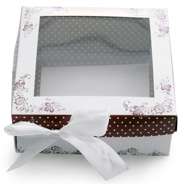 בריסטול אמריקאי איכותי 350 גרם, דופן כפולה וחלון שקוף. ניתן להוסיף חוצצים המחלקים את האריזה ל-9. בסיס ומכסה מופרדים. ניתן להשחיל סרטי סאטן לפי בחירה (מגיע ללא הסרט, ניתן לרכוש אצלנו גלילי סאטן).
