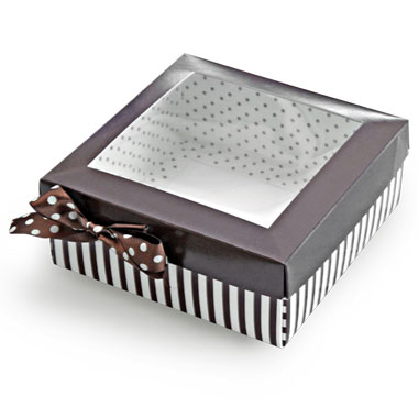 בריסטול אמריקאי איכותי 350 גרם, דופן כפולה וחלון שקוף. ניתן להוסיף חוצצים המחלקים את האריזה ל-9. בסיס ומכסה מופרדים. ניתן להשחיל סרטי סאטן לפי בחירה (מגיע ללא הסרט, ניתן לרכוש אצלנו גלילי סאטן).